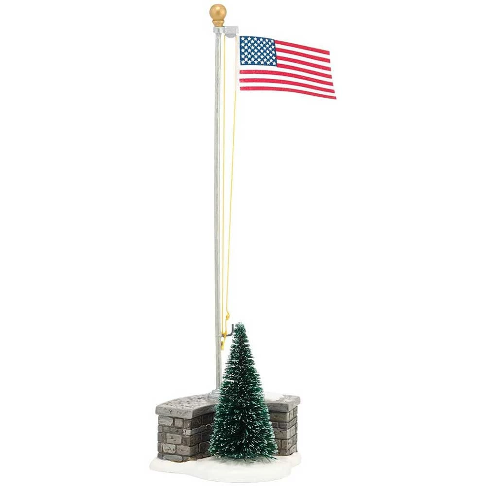 Stars and Stripes. American Flag Figurine. Part of the General Village collection by Department 56. Made from porcelain, plastic, sisal, nylon and metal.